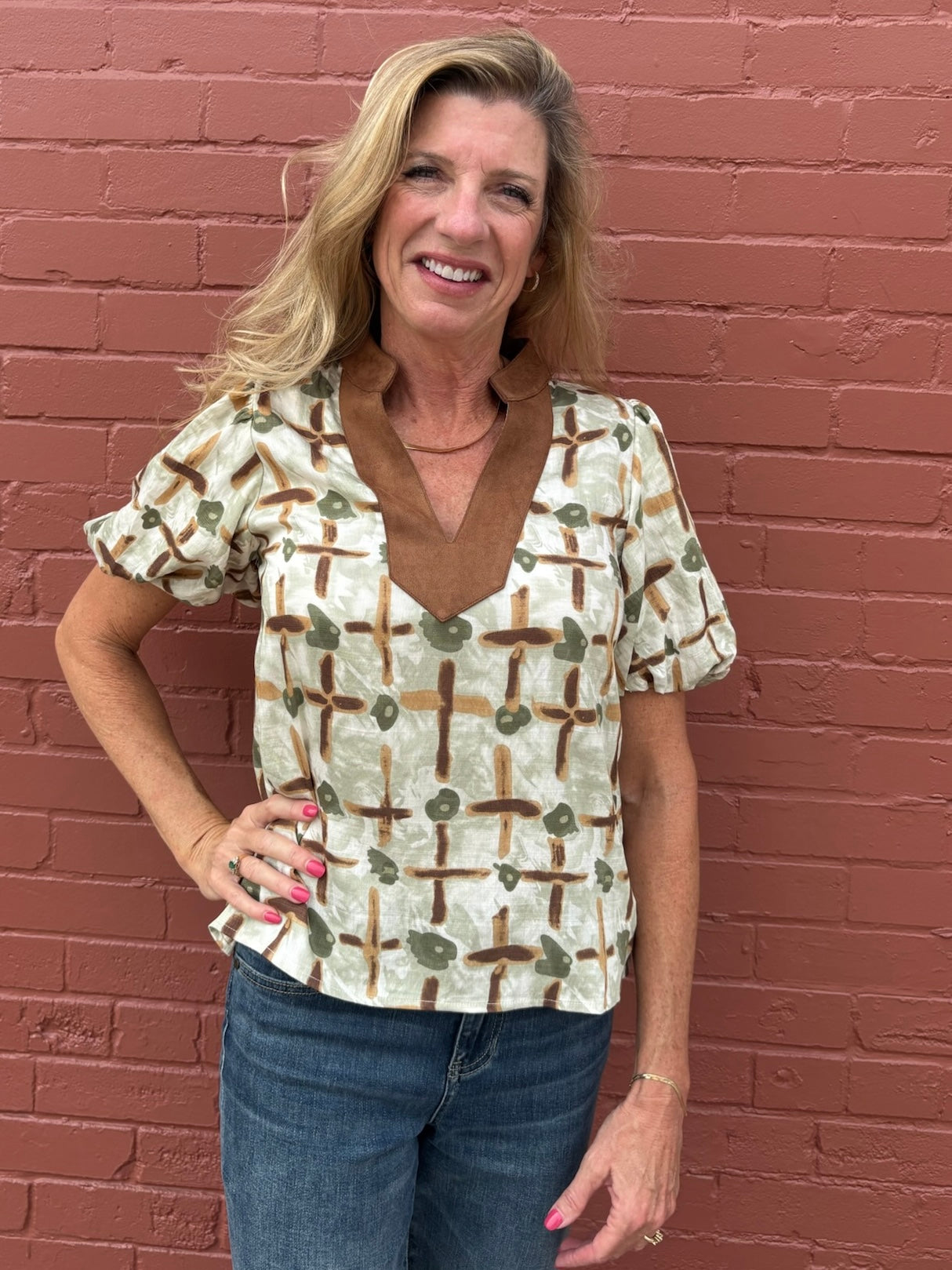 *FINAL SALE* Contrast Collar Puff Sleeve Print V Neck Top