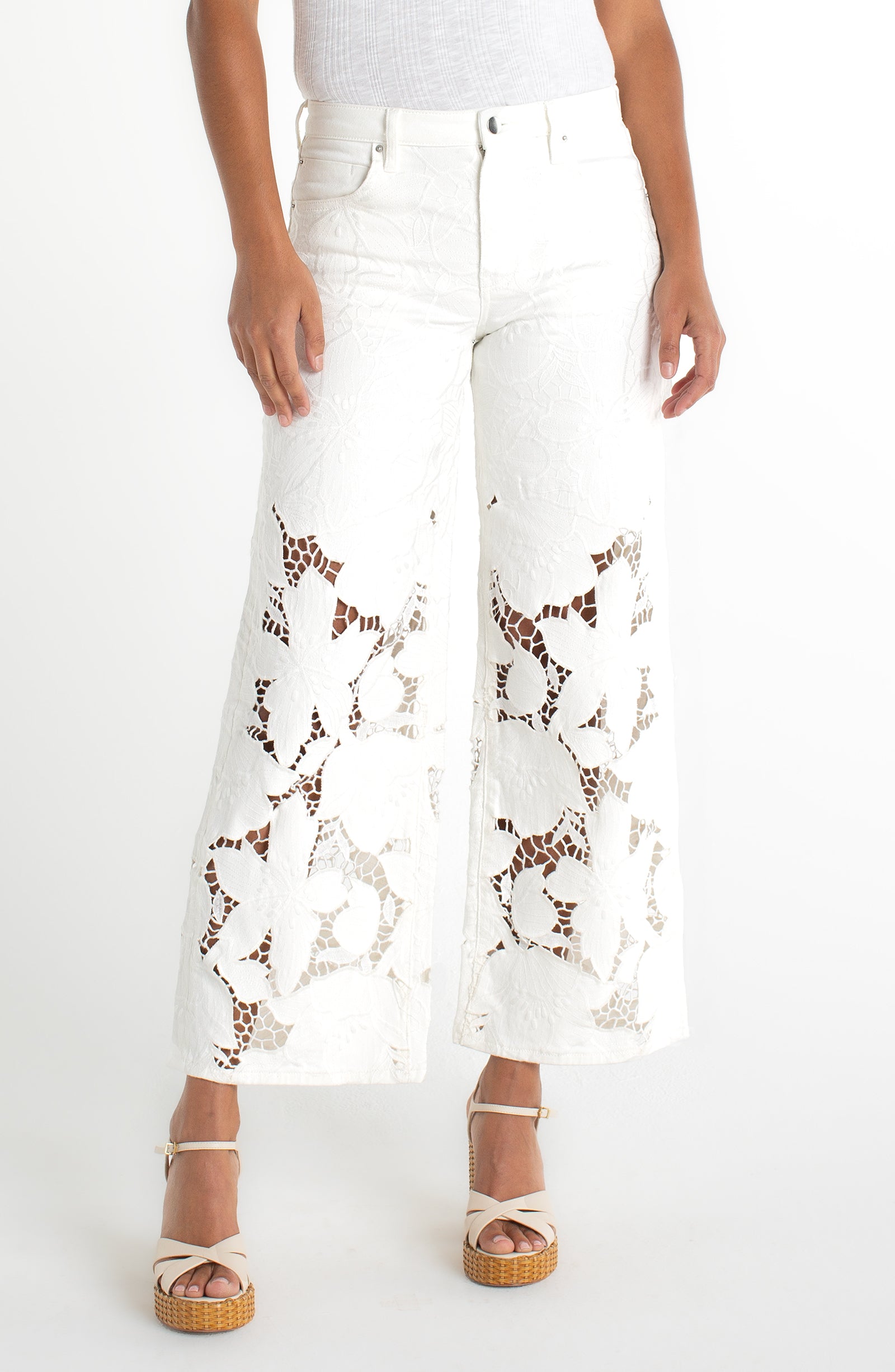Liverpool Stride Wide Leg Jeans with Floral Cutwork in Ivory Bloom
