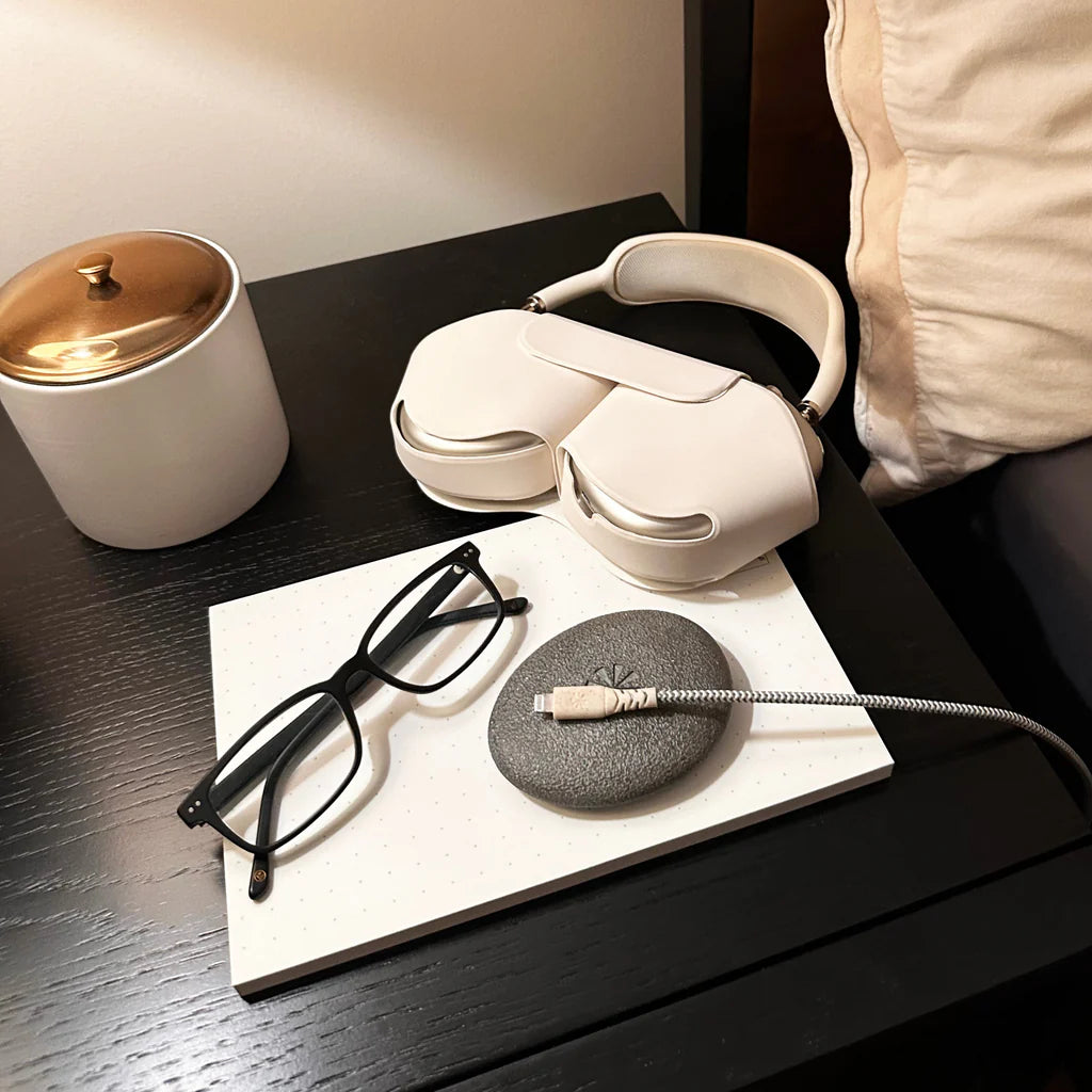 This magnetic stone is the perfect hangout for your cord. Strong internal magnets attract your cord & hold it for you when you can’t. Perfect for bedside tables, office desks & counters.