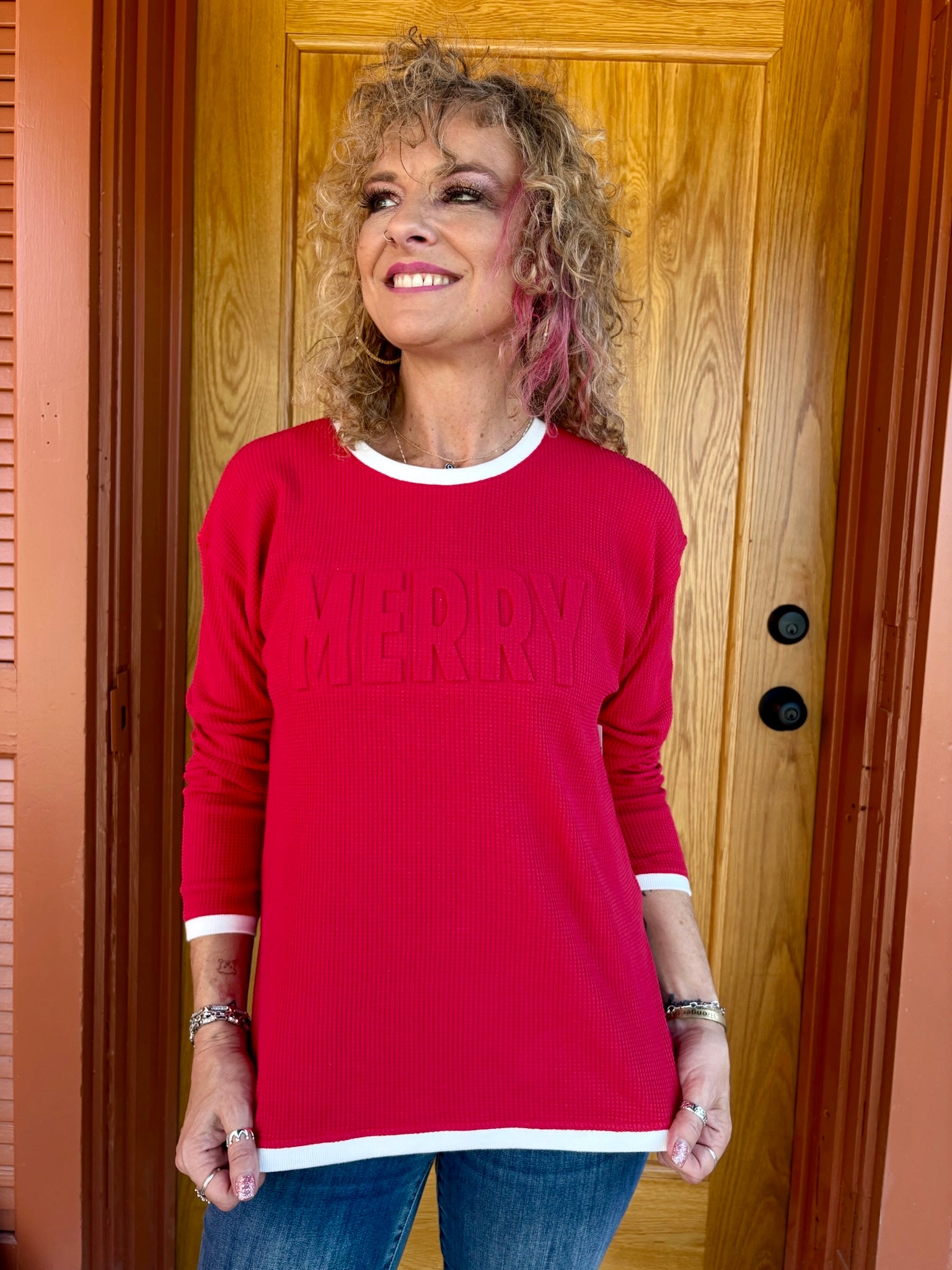 Merry Embossed Waffle Sweatshirt in red at ooh la la! in Grapevine TX 76051