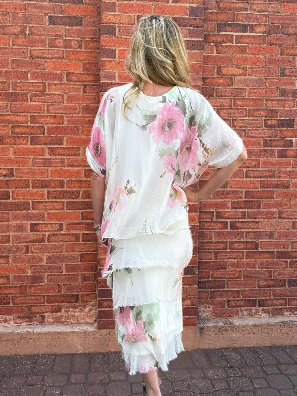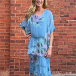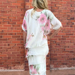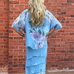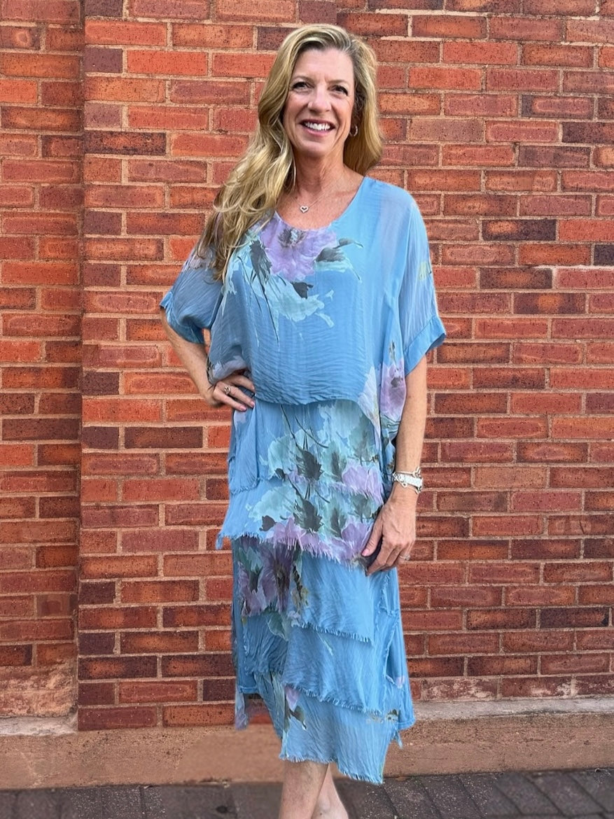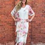 Check out this gorgeous new dress! It’s a short sleeve ruffle long silk dress with a beautiful watercolor floral print. It has a wide short sleeve silk overlay on top, and the bottom is covered in tiered ruffles. The neckline is a round one, and it’s lined for comfort.