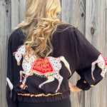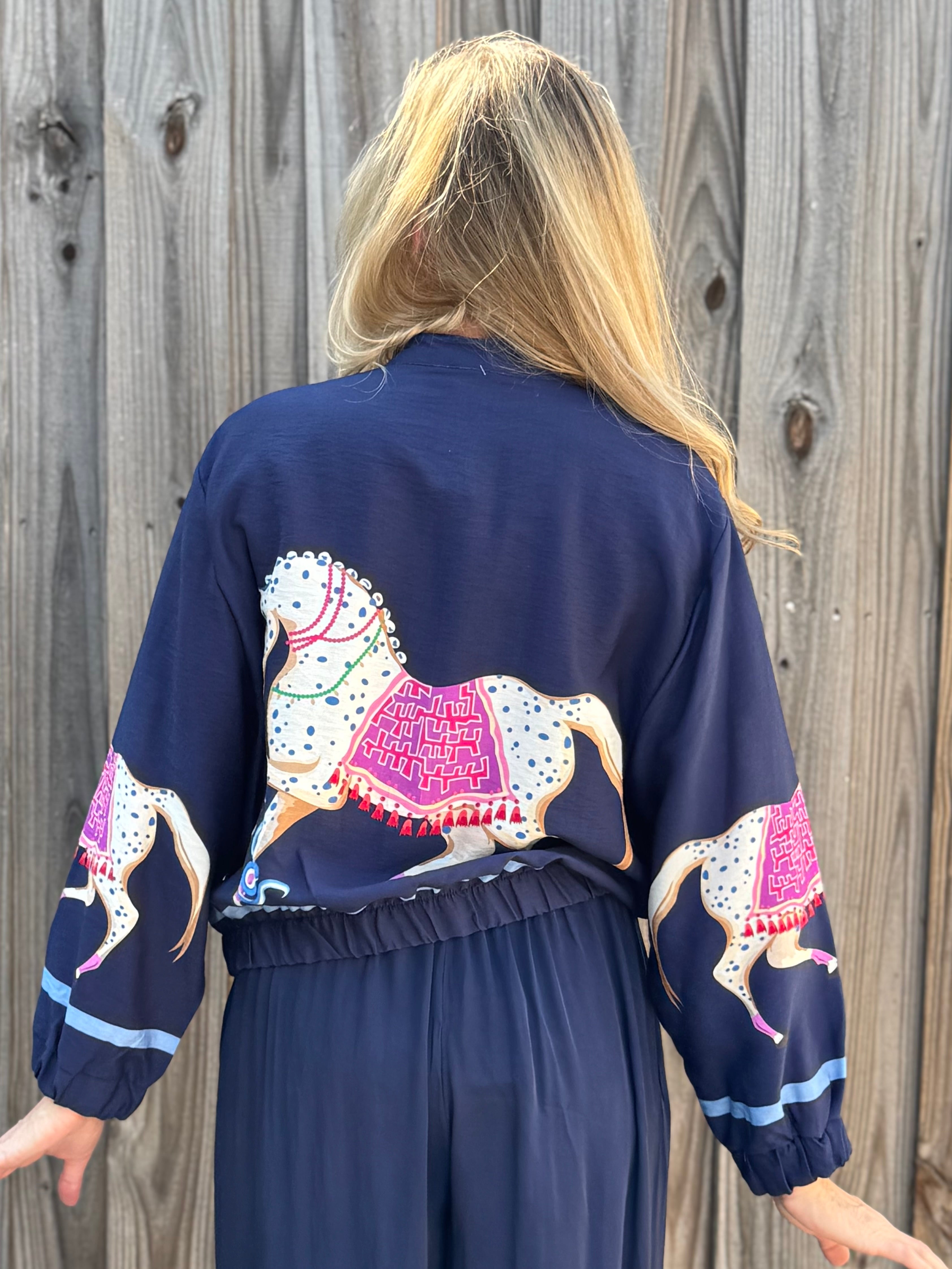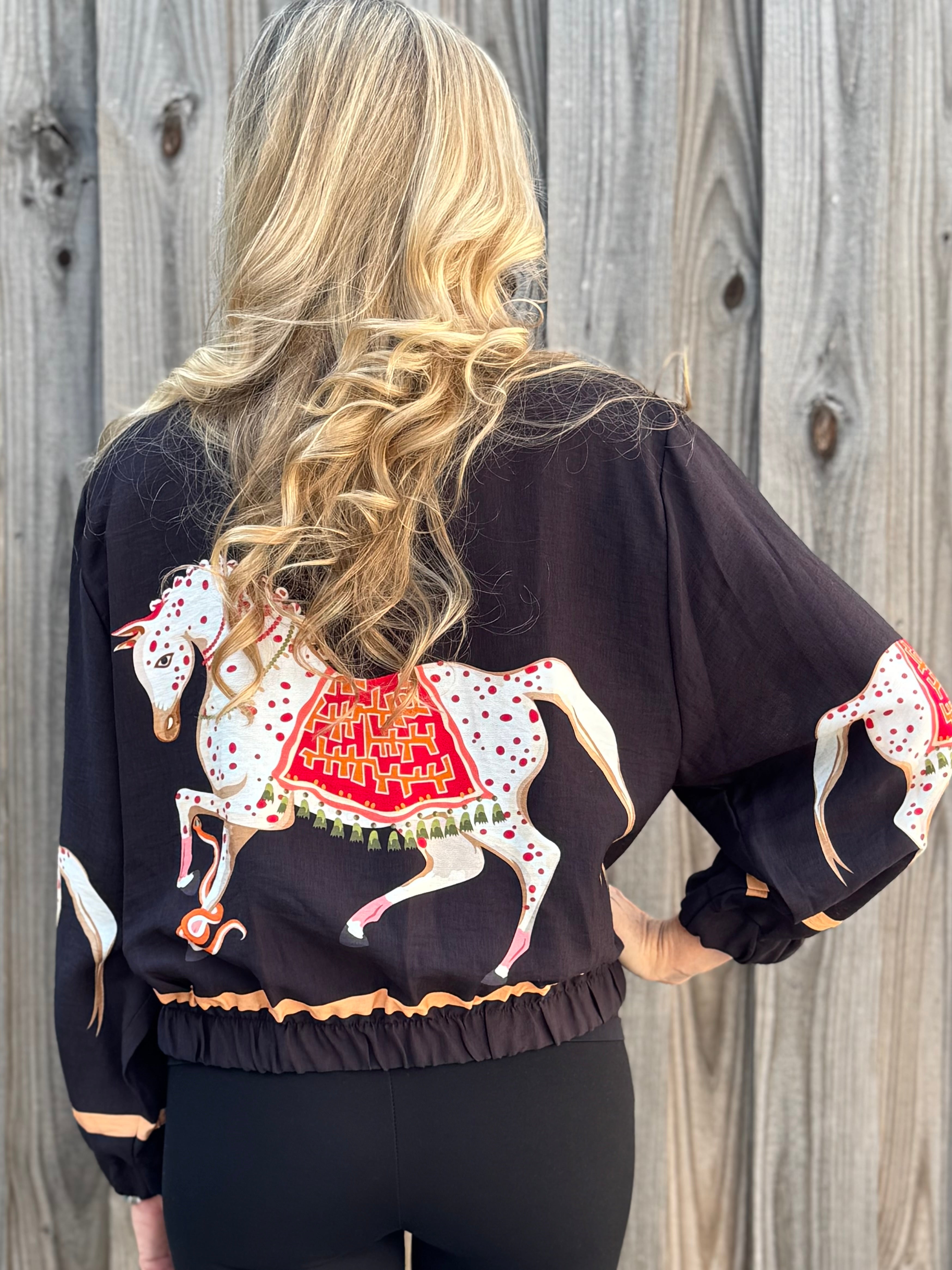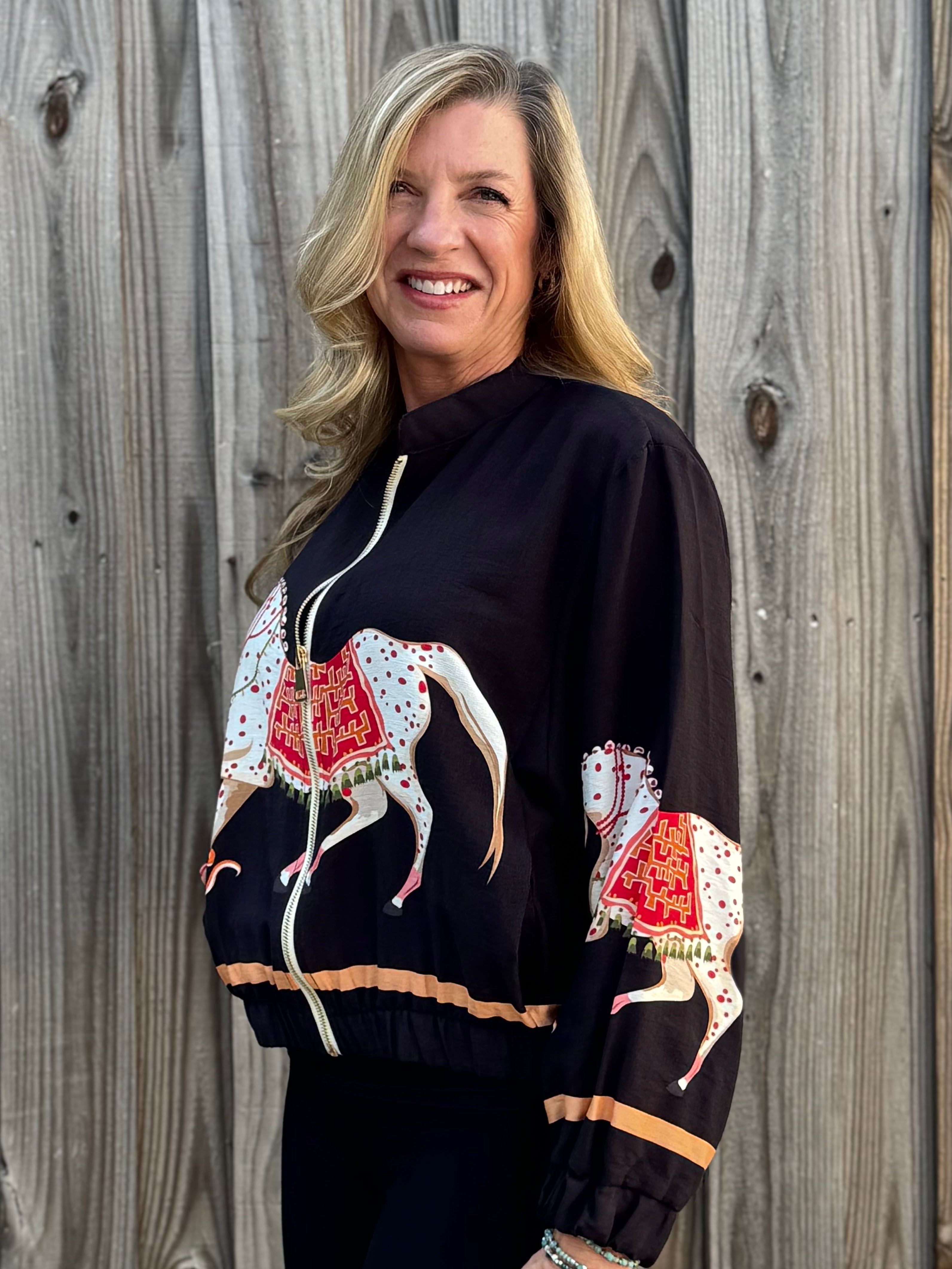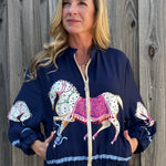 Saddle up in style with our whimsical stunning Horse Print Bomber Jacket This statement piece features beautifully detailed prancing horses trimmed in bold pops of fuchsia, ivory, and sky blue. The gold zipper and gathered hem give it that chic, polished finish—perfect over denim or dressy trousers when you’re feeling effortlessly equestrian and fashionably fierce.