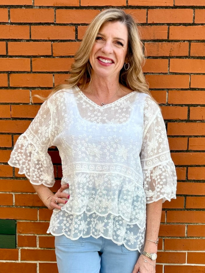 Embrace effortless elegance with this 100% cotton floral lace blouse featuring romantic tiered bell sleeves. This breathable boho-chic top showcases intricate scalloped edges and a delicate V-neck for a timeless, feminine silhouette.