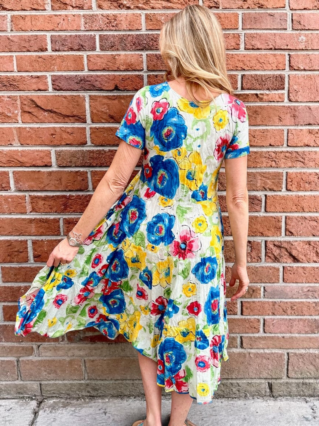 Experience effortless elegance in this breathable, 100% organic cotton midi dress featuring a vibrant blue floral print. The expert bias-cut design uses over four yards of fabric to create a dramatic, flowing silhouette that flatters every move.