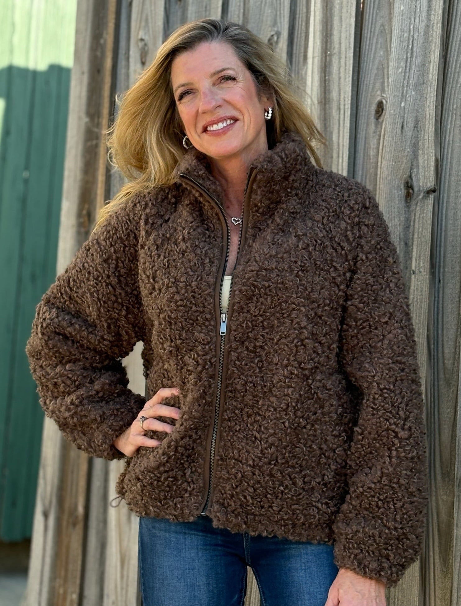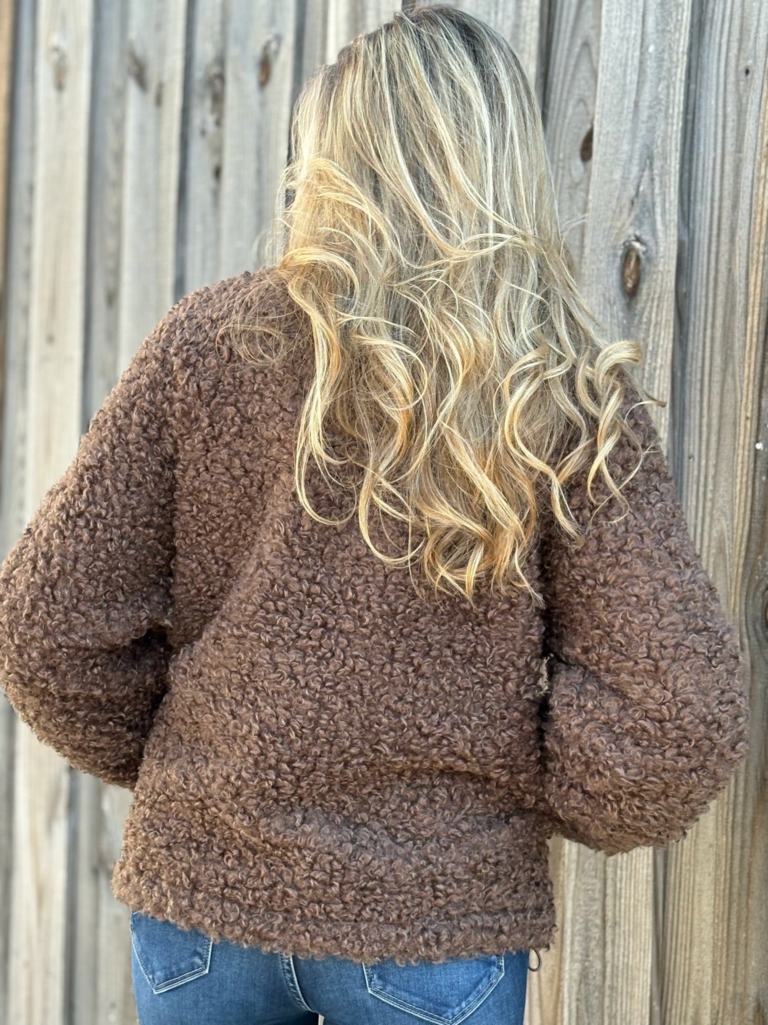 Cozy, cute, and irresistibly soft—our Poodle Fur Sherpa Zip Jacket is the perfect throw-on layer for chilly days. The rich brown poodle-curl texture gives it a plush, luxe feel while the full zip front makes it easy and versatile to wear. Side pockets keep your hands warm, and the relaxed fit layers effortlessly over your favorite tees and sweaters. A comfy everyday jacket that still brings plenty of style.