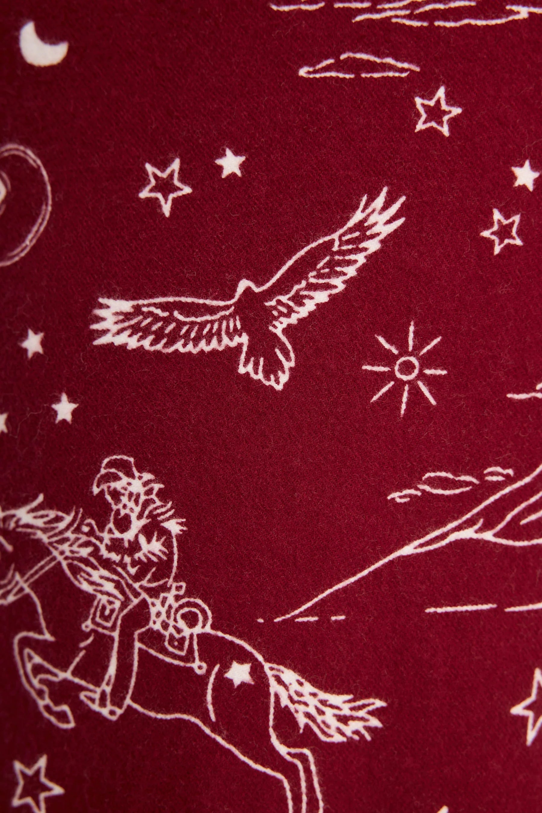• Women’s full-length flannel lounge pant in rich burgundy with a Western desert print featuring riders on horseback, cowboy hats, horseshoes, soaring birds, stars, and mountain ranges.