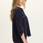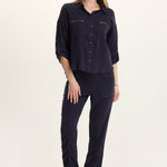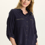 Featuring snap buttons and zippered breast pockets, this utility-inspired blouse can also be worn as a light jacket, making it perfect for various occasions and temperatures.
