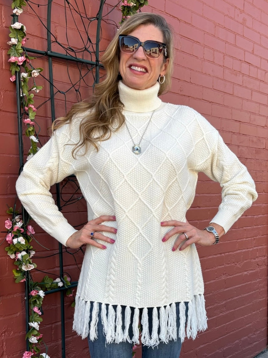Fringe Hem Pullover Cable Sweater