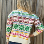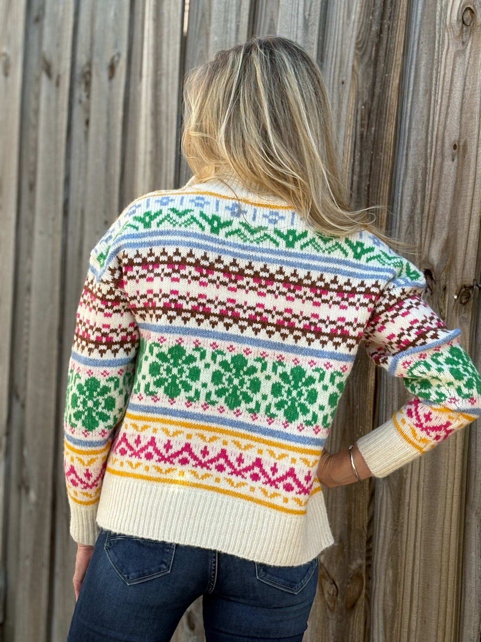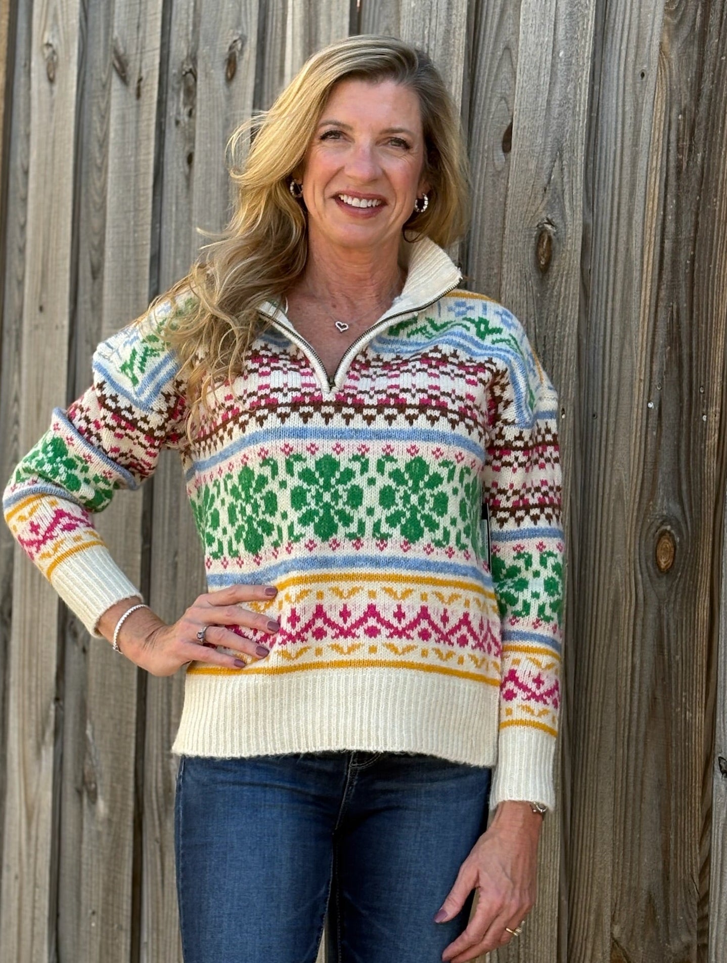 Meet your new cheerful cold-weather favorite! The Urania Patterned Half Zip Pullover Sweater features a cream knit base with colorful Fair Isle patterns in green, pink, mustard, brown, and blue. Cozy, soft, and easy to style, this half-zip design adds a fun pop of color to your winter wardrobe—perfect with denim for everyday wear or festive outings.