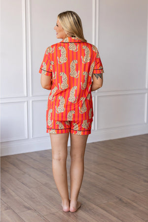 Our cheeky and fun Jungle Wild pajama set includes a button-front shirt with piping trim and a matching elastic-band short with pockets and button details on the front.