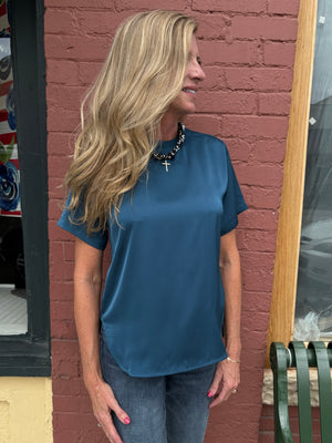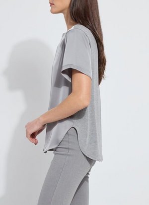 The Aline Crew Neck Mix media top features a rib neckline, 4-way stretch Jersey back for comfort and movement, and a Soft Touch Satin front and sleeves. This easy fit top offers beautiful drape and a rounded, high-low hem.