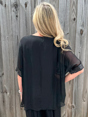 This Short Sleeve Silk Blouse sparkles with sequin details on the sleeves and beneath the hem, adding an elegant touch of shine. It’s the perfect match for our Silk Pants, which also sparkle with sequin accents for a coordinated, playful outfit.